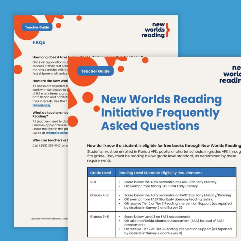 New World Reading is a free literacy program in Florida, administered by the University of Florida Ruttinger Learning Center, designed to help close the reading gap and make reading more fun and accessible. The goal is to help Florida’s struggling readers strengthen literacy skills, build reading confidence, and develop a lifelong love of reading. Eligible students will receive a free book at home each month throughout the school year.
